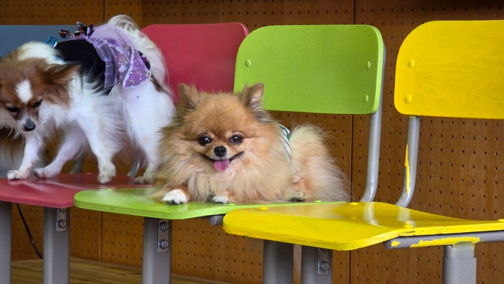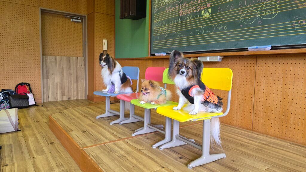 同じお里で生まれた子達!緑色のイスに座ってる子がベガ君に兄弟!!生まれた頃、同じ犬舎で遊んでた子達、きっと覚えてるよね!