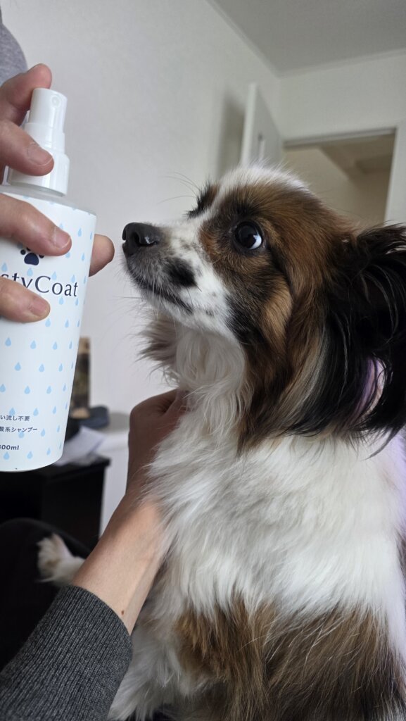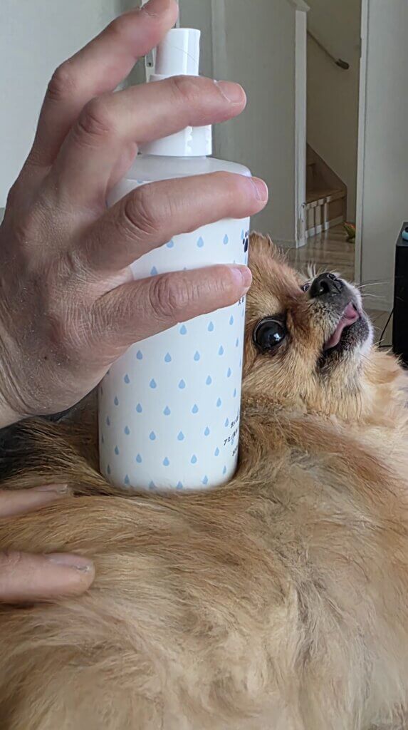 使い方は、ワンコに吹き付け、マッサージするみたいに揉んであげればOK!それか手に吹き付けてから毛並みに付けてもいいみたいです。